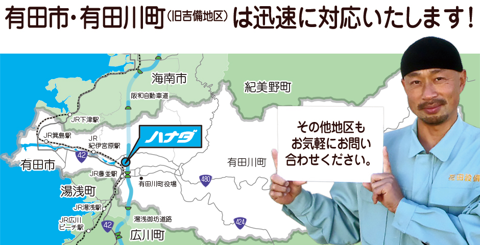 ハナダは機動力が自慢です!有田川町(旧吉備地区)および、有田市ならば迅速に対応いたします。