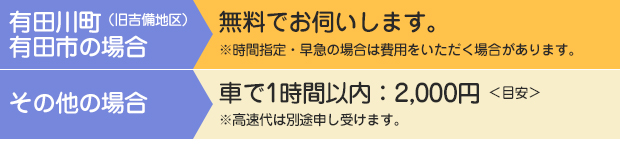 旧吉備地区以外の有田川町内や、近隣の海南市、湯浅町、広川町、和歌山市もお伺いすることも可能ですが、その場合「迅速に」とはいかないこともございます。また交通費・高速代などを頂戴することもございますのでまずはお問い合わせください。